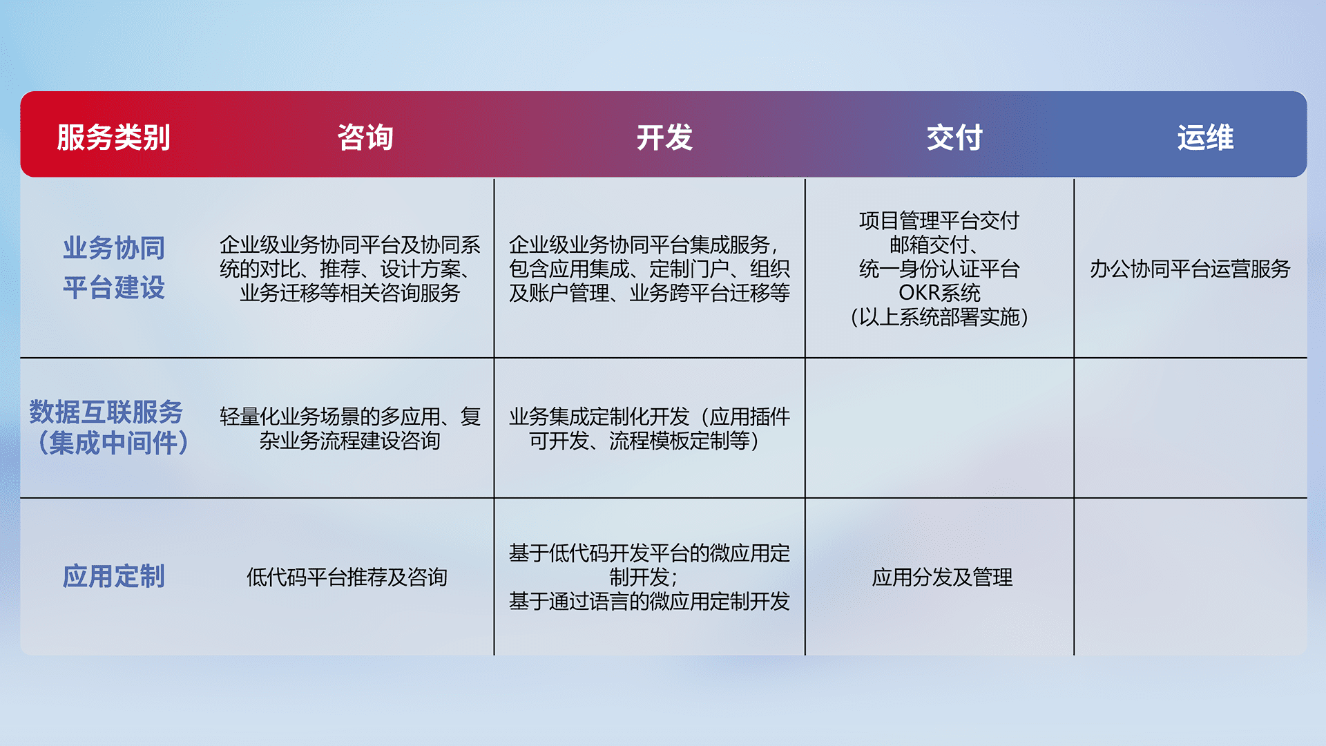 针对钉钉、、企微、、、IDaas等平台级产品提供产品的规划、、、方案、、、、交付、、定制化开发等服务,,实现如统一协同办公、、、、智能客户服务、、混合会议管理、、智能数据查询、、、等业务场景,,,,实现数字化转型。。