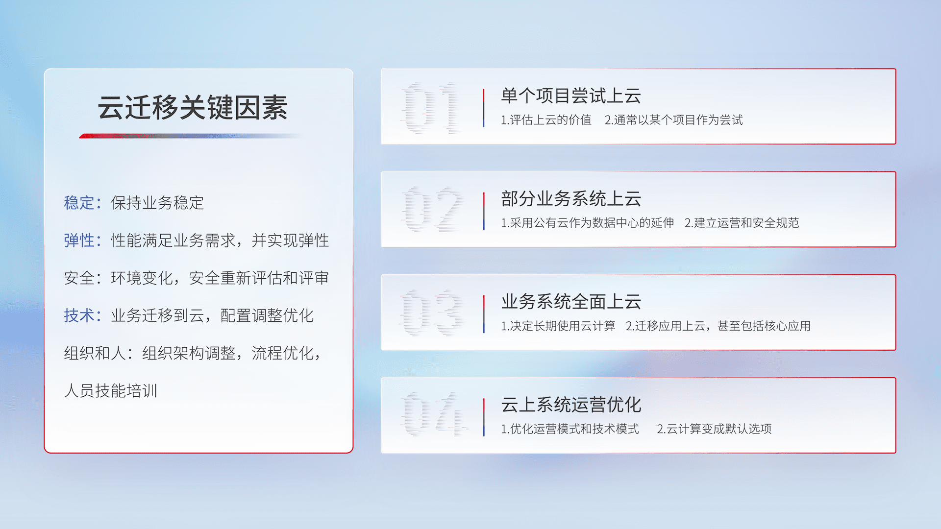结合实际业务,,,从规划设计、、云平台选型、、云原生改造、、、、数据迁移、、、集成交付,,,迁移全过程为客户识别最佳上云路径,,,,做好风险识别管理,,,,设计网络架构、、、身份权限、、、、安全审计合规、、、、操作审计、、、日志审计、、监控告警策略、、多站点容灾设计等,,,对云上基础设施进行整体规划,,提升IT治理水平,,以满足弹性、、、、高可用、、高性能的需求。。