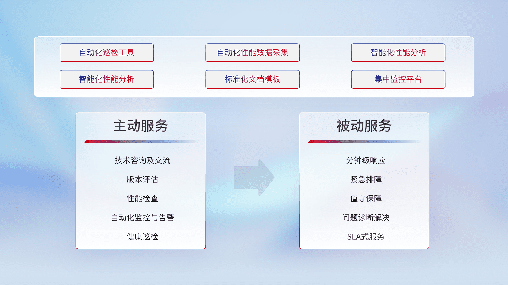 智能化工具和标准化文档,,保障服务质量,,,提供主动服务(包含技术咨询、、版本评估、、性能检查、、自动化监控与告警、、健康巡检)和被动服务包含(分钟级响应、、、紧急排障、、、、值守保障、、问题诊断解决、、、、SLA服务)。。。。